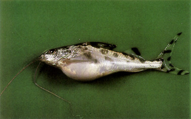 (English) The belly of the fish is swollen because of increased moisture content through bacterial infection. (See also: belly)