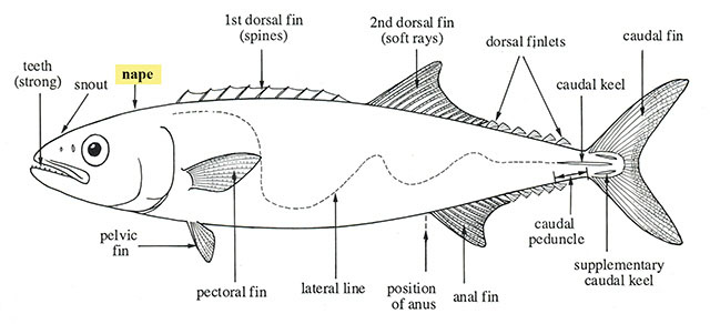 (English) 1) The part of the back that extends from the margin of the skull to the dorsal-fin origin; also, the region of the head above and behind the eyes, 2) the thickest part of a fish fillet. (See also: posterior, occiput, nuchal)