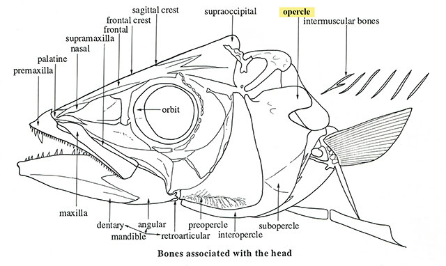 (English) The large bone which forms the upper posterior part of the operculum; often bears one to three backward-directed spines in the higher fishes; usually the largest of the thin bones forming the gill cover in bony fishes. Sometimes used in aging studies. (See also: operculum, bony fishes, gill)