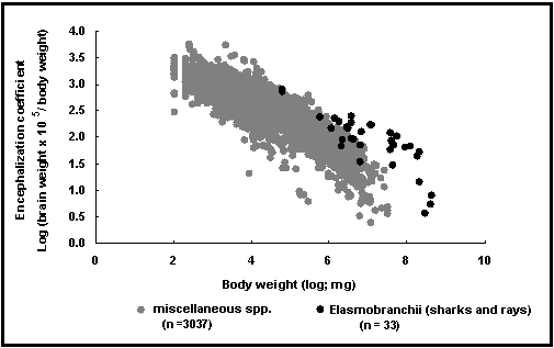 Fig. 49. Relationship between relative brain weight and body weight. Light dots: miscellaneous records in FishBase; black dots: data for sharks and rays, which have large brains, possibly to support their electrosensing ability. In contrast, 6 of the dots below the cloud belong to lampreys.
