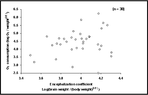 Fig. 50. Oxygen consumption vs. relative brain weight in 30 species of fishes. See Box 33 for a discussion of this graph. |