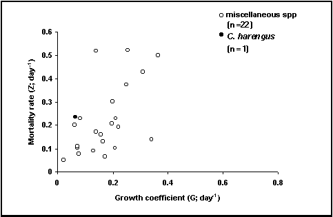 Figura 42. Relação entre crescimento e mortalidade larvar. Pontos claros: todos os dados da FishBase. Pontos escuros: registos para larvas de Arenque.