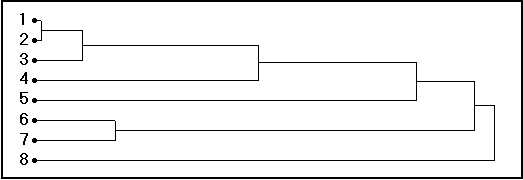 Fig. 20. Dendrograma AUXIM da similaridade (eixo-X em unidades arbitrárias) no "espaço crescimento" definido pelo AUXIM para os Gadidae, com 1= Theragra chalcogramma; 2 = Trisopterus luscus; 3 = Merlangius merlangus; 4 = Micromesistius poutassou; 5 = Melanogrammus aeglefinus; 6 = Gadus morhua; 7 = Pollachius virens; 8= Trisopterus minutus. Como se constata, Theragra chalcogramma e Trisopterus luscus dum lado e Gadus morhua e Pollachius virens do outro, formam dois grupos bem separados, as outras espécies aglomeram-se sucessivamente.
