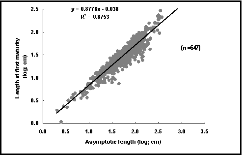 Froese, R. and C. Binohlan. 2000. Empirical relationships to estimate asymptotic length, length at first maturity and length at maximum yield per recruit in fishes, with a simple method to evaluate length frequency data. J. Fish Biol. 56:758-773.